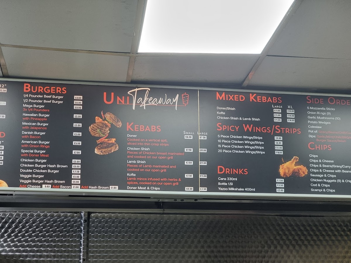 From a reviewer’s perspective, the menu at Uni Takeaway on 102 Wood Rd, Treforest, Pontypridd CF37 1RJ offers a broad and satisfying range of comfort foods that cater to varied tastes. Starters like Garlic Pizza Bread: Plain set a simple yet appealing tone, while the burger selection-from the classic 1/4 Pounder Beef Burger and 1/2 Pounder Beef Burger to the more indulgent Mega Burger, Hawaiian Burger With Pineapple, and Mexican Burger With Jalapenos-provides hearty options for anyone craving a substantial bite. The kebabs, including Doner, Chicken Shish, Lamb Shish Kofte, and the combo Doner Meat & Chips, are complemented by mixed varieties like Doner/Shish, Kofte, Chicken Shish & Lamb Shish, offering flavorful alternatives for sharing or sampling multiple styles. For spice lovers, the 5 Piece Chicken Wings/Strips, 10 Piece, 15 Piece, and 20 Piece Chicken Wings/Strips bring a satisfying kick, while side orders such as 5 Mozzarella Sticks, Onion Rings, Garlic Mushrooms, Potato Wedges, and Coleslaw round out the menu with classic accompaniments. The chip options are extensive, from Chips, Chips & Cheese, and Chips & Beans/Gravy/Curry Sauce to the fish-focused Cod & Chips and Scampi & Chips, catering to both traditional tastes and those looking for something more filling. Pizza lovers are equally well-served with choices like Margherita, Cheese & Onion, Ham & Pineapple, Double Pepperoni, and Chicken & Mushroom, ensuring a comforting and familiar takeaway experience. Overall, Uni Takeaway’s menu balances variety with accessible, popular dishes, making it a reliable spot for a quick, satisfying meal.